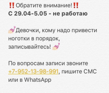 Девочки, расписание на май опубликую уже завтра, следите за темой) Ну а пока напоминаю, что с 29.04-05.05 - не работаю!!! В апреле есть еще 3 свободных места для записи,записывайтесь!))