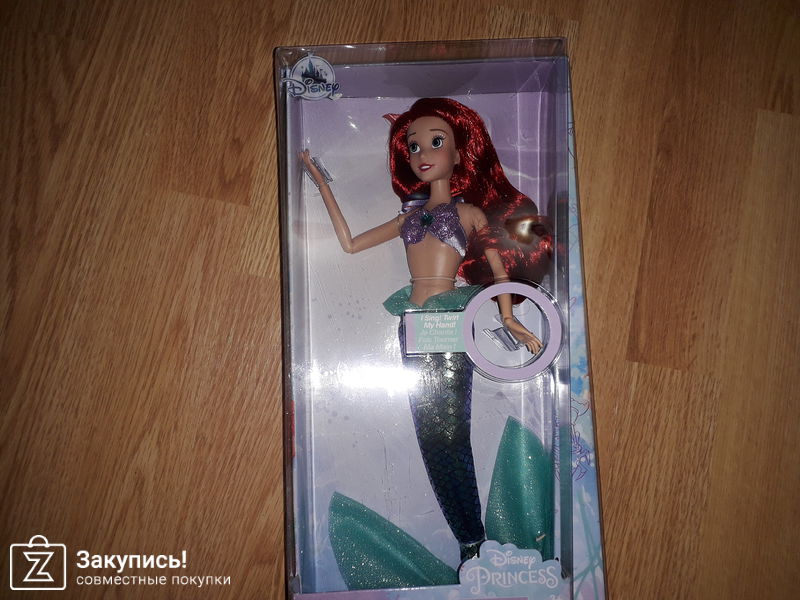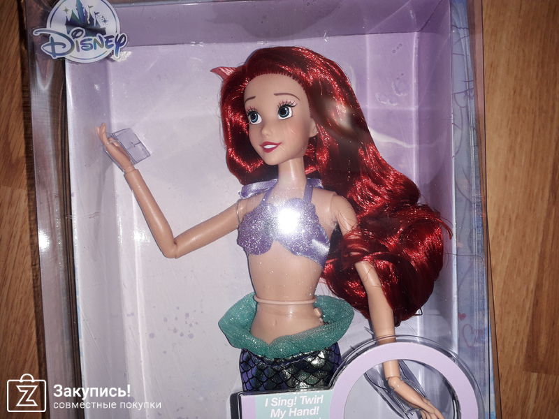 Поющая принцесса русалочка Ариэль из Disney, брала в период хороших скидок, в качестве подарка (невестам из садика)))) она КРУТАЯ!!!, ооооочень красивая, роскошные волосы, руки на шарнирах, высота около 30 см, мерцающий атласный хвост с имитацией чешуи, под хвостом классические ноги, поет при поворе руки.