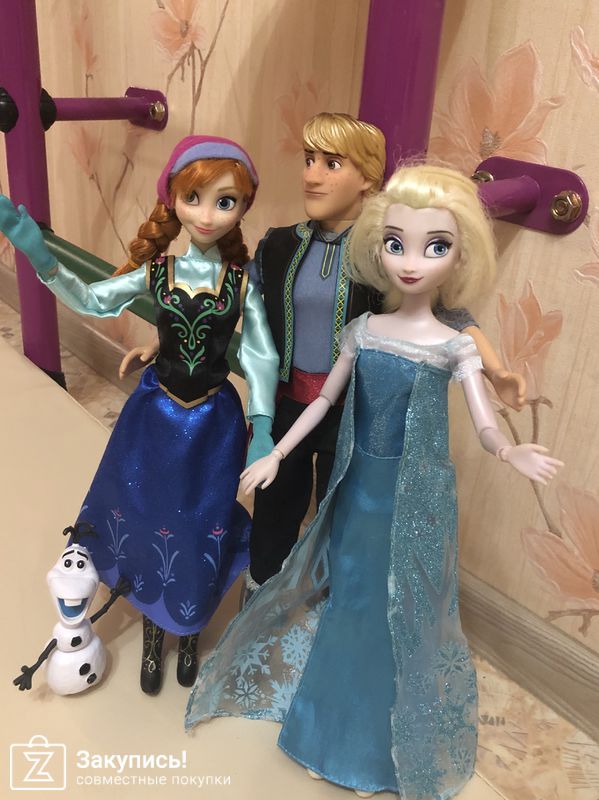 И, соответственно, вся наша фроузеновская семейка. Эльза старушка, волосы уже не те, у платья рукава порвались из-за любви дочери всех переодевать)) У Кристофа кисти и ноги не гнутся, волосы резиновые, зато прическа никогда не испортится))) Олаф был в комплекте с Эльзой, но сейчас все куклы с кольцами в комплекте.