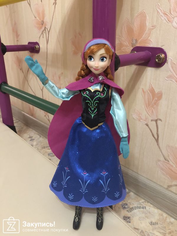 Наше последнее приобретение-Анна. Ну прям класс! Она такая милаха! С веснушками. Костюмчик прямо как в мульте, само собой платье блестит. Сапожки на каблучке. Напоминаю, у классических кукол руки на шарнирах в плечах, локтях и кистях. Резиновые ноги гнутся в коленях. В комплекте идёт кольцо, подходит на детский палец.