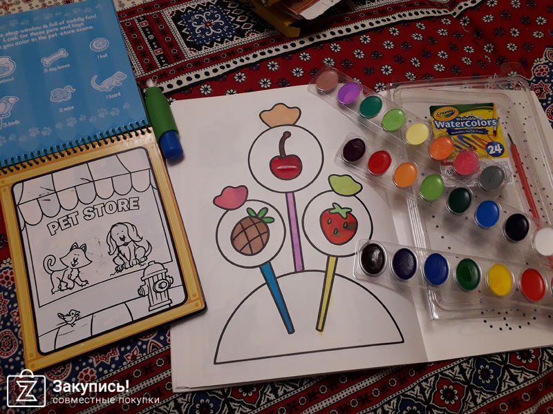 Получила краски, начну с того что вообще не люблю акварель))) НО это же крайола, заказала на пробу и не пожалела, цвета ооочень насыщенные, раскрашивают без проблесков, смешиваются между собой хорошо, я довольна! Еще хочу показать многоразовую водную расскраску, которой пол-года!!! Она у нас если не ежедневного, то регулярного использования. Кое где коцки -это ребенок не красил, а тыкал кистью, поверьте те расскраски что продают у нас столько точно не протянут. Еще понравилось что есть мини задания, найти на картинке \"спрятанные\" предметы.