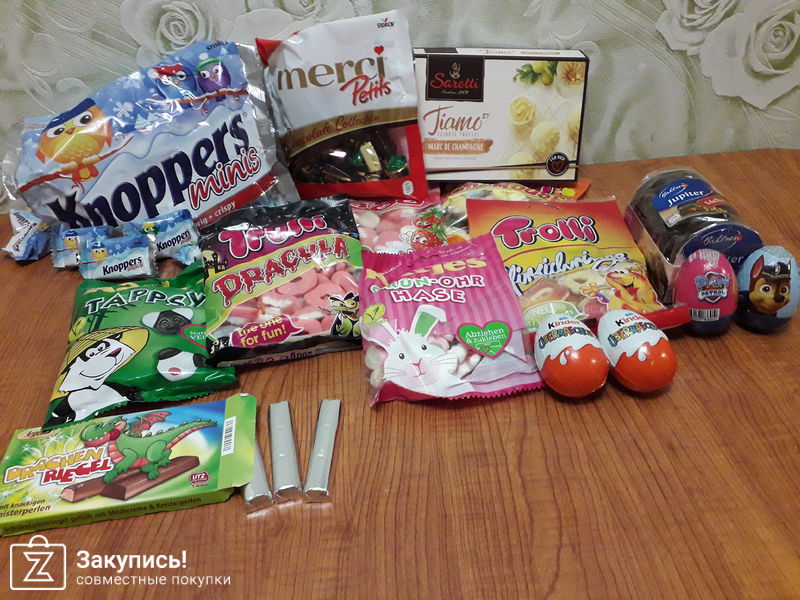 Германия, сладости. Перепробовав все что брала -отписываюсь) Пряники были съедены первыми, мягкие, ароматные, в шоколадной глазури - вкуснотища! моя любовь! очень жаль что пекут их только к рождеству... вафельки knoppers в индивидуальной упаковке, удобно брать с собой,с нежным кремом, молотым фундуком, очень вкусно! Трюфели де шампань достались мужу. В шоколадках с драконом взравающаяся карамель, шоколад немного хуже чем в привычном киндере. Мармелад весь мягкий, из всего разнообразия хочется выделить персиковые кольца- с кислинкой. И которые в форме зайцев фирмы Katjes, сильно похожи на фруттелу, и консистенцией и вкусом. Киндеры порадовали внешним видом, пришли целые, попробовать не удалось))) Глаза - что то среднее между суфле и мармеладом внутри кислая начинка. Чупачупс страсти мордасти- со вкусом колы. Ну и для унитаза красителя не пожалели. В общем вкуснота да и только)))