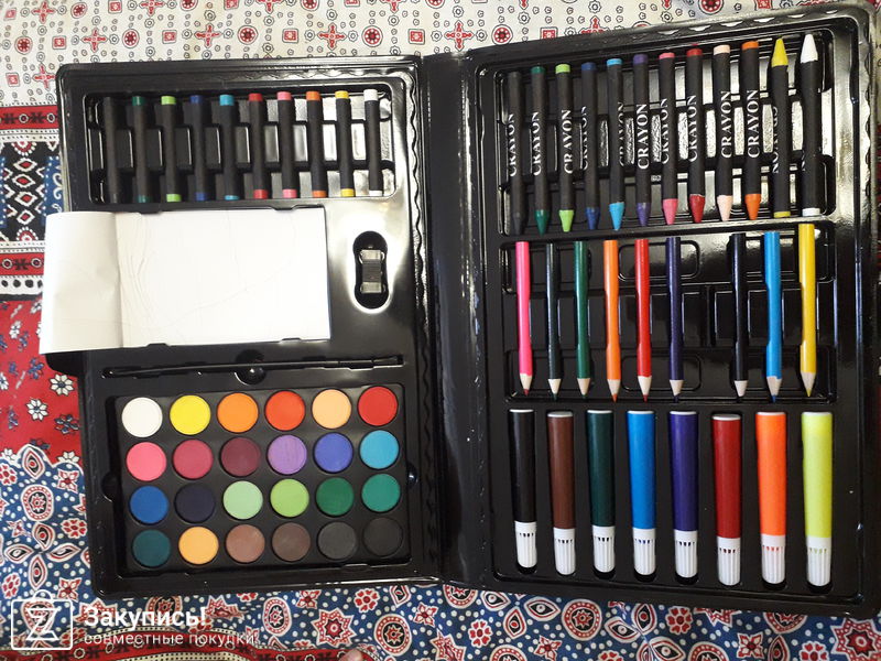 Спешу поделиться своими впечатлениями о \"Наборе художника\". Со всеми сборами и доставкой вышел 470 руб. Как бы это было не удивительно, но сравнивать я его буду с любимой крайолой. Восковые и простые карандаши ни сколько не уступают, мягкие, рисуют ярко, при минимальном надавливании. Краски в форме таблеток необходимо хорошо пропитать водой для насышенного цвета. Фломики подкачали немного, жесткие, чувствуется как бумагу царапают. Ребенок 2.5 лет кейс оценил по полной, после рисования сидел и с удовольствием все по местам раскладывал.