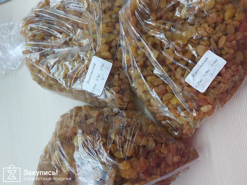 По поводу изюма хочу отметить, что попадается сор в виде веточек. Хочу отметить, что покупала с лотка по схожей цене, так вот в закупке изюм мельче. Рядом с пакетами из закупки на фото приложила фото пакета с изюмом с лотка.