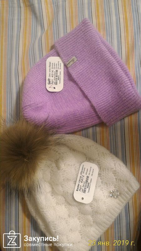 Состав шапок соответствует описанию сайта.Сиреневая шапка в 1 слой,поэтому её можно носить до -10-15º без ветра.Белая шапка теплая(в составе есть мохер),в 2 слоя,не объемная-сидит аккуратно по голове.Меховой помпон примялся во время доставки,но это исправимо.С момента заказа до дня получения=месяц.