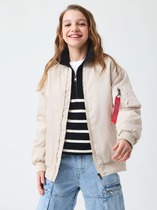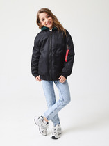 Легкая стеганная куртка -бомбер для девочки с яркими трикотажными подвязами. Дополнена двумя прорезными карманами.
