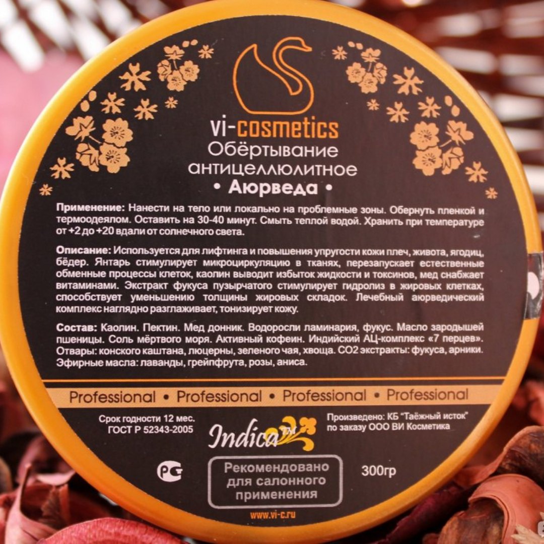 Янтарь стимулирует микроциркуляцию в тканях, перезапуская естественные обменные процессы клеток, каолин выводит избыток жидкости и токсинов, мёд снабжает витаминами. Экстракт фукуса пузырчатого стимулирует гидролиз жиров в жировых клетках и способствуют уменьшению толщины жировых складок, содержит йод в биодоступной форме, что необходимо для нормализации обмена веществ в подкожной жировой клетчатке и исчезновению проявлений целлюлита. Лечебный аюрведический комплекс наглядно разглаживает, тонизирует и оздоровляет кожу. При соблюдении диеты после курса из 10-12 обёртываний и общего комплекса АЦ-процедурнаглядно пропадает эффект «апельсиновой корки».