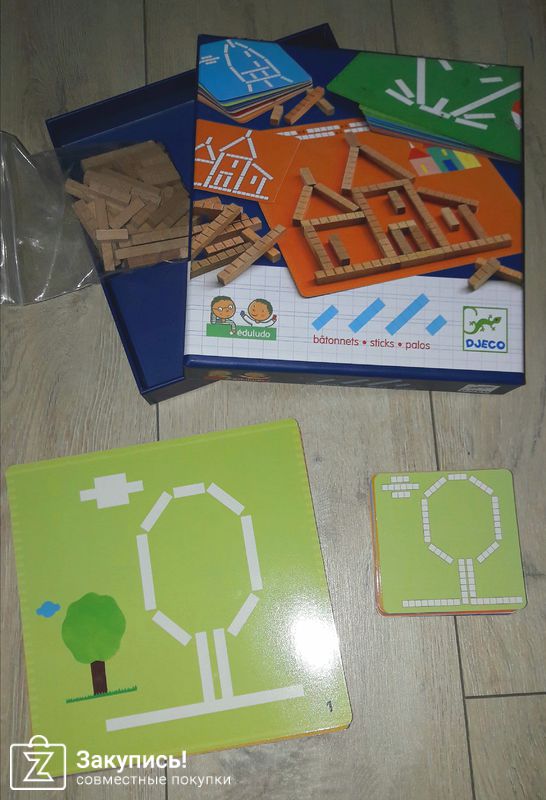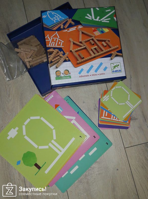 12 карточек: двустороние, жесткий глянец (хотелось бы матовые, палочки скользят) 3 уровня, нижний правый угол акцентирует об этом. Мини карточки идут как подсказка, на них обрисованы линии/квадратики.