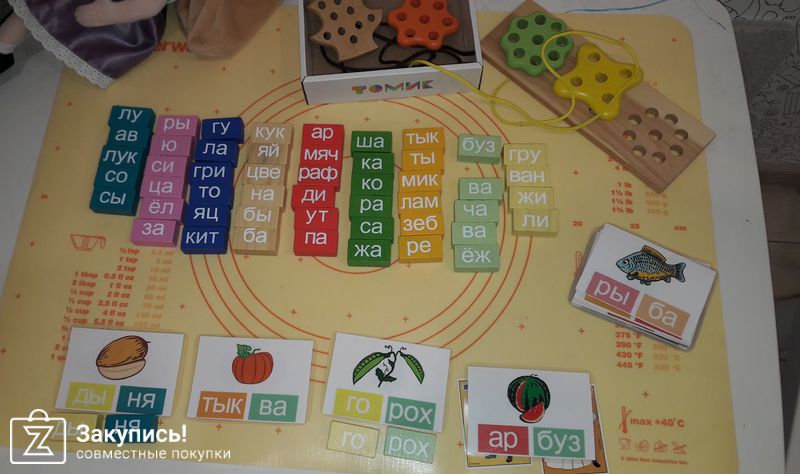 Просто концентрируем внимание: цвета кубиков, разделение слова на части/слоги, количество буковок на кубике.. и конечно на внимательность: совпадение элементов на кубике и карточке)))