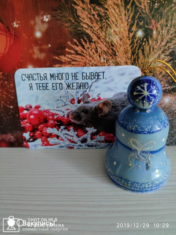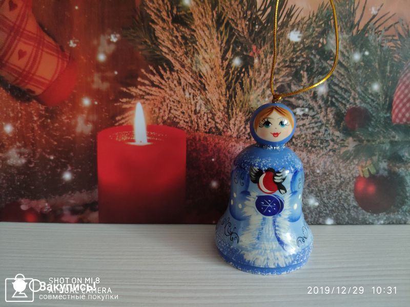 Колокольчик средний. Заказывала новогоднюю фигурку со снегирем. Прямо зимушка- зима в шубке, рукавичках, со снежинками, местами украшена росписью с блёстками. Приятное поздравление от организатора с наступающим Новым годом! Галина, спасибо за закупку и с наступающими праздниками!