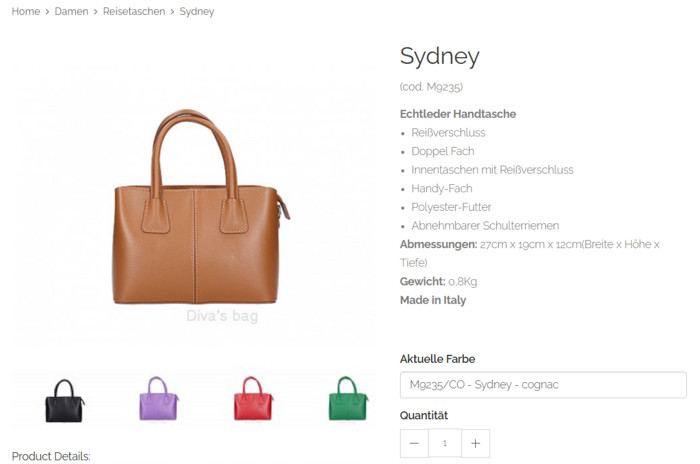 Цвет выбирается в поле Aktuelle Farbe, чуть ниже описания самой сумки - на каждый цвет еще и свой артикул.