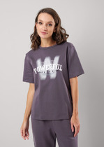 Джемпер из хлопкового трикотажного полотна. Короткий втачной рукав. Круглый вырез горловины. По переду термоапликация.— Описание у На сайте поставщика