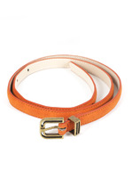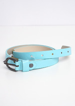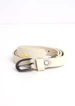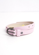 Узкий ремень из лакированной кожи с металлическими деталями. Застёжка на пряжку.