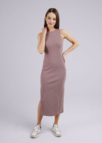 Платье прилегающего силуэта длины миди, без рукавов, горловина и пройма обработаны обтачками