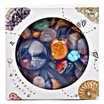 В состав набора входит: Самоцветы различных форм и цветов; Карта для изучения видов и месторождений; Шкатулка либо мешочек из органзы;