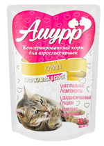 Влажный корм для кошек. Состав: Мясо и субпродукты (курица не менее 35%), злаки, таурин, минеральные вещества, витамины.