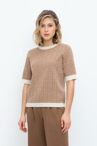 Джемпер из вискозной пряжи с добавлением нейлона, переплетение ластик. Длинный втачной рукав, расклешенный книзу. Контрастные полосы по низу рукава, воротнику и планке. По горловине отложной воротник с планкой и застежкой на пуговицы.