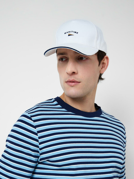 Бейсболка мужская. Модель выполнена из однотонной ткани белого цвета и украшена вышивкой. Классическая форма с изогнутым козырьком с контрастным кантом и металлической застёжкой-пряжкой сзади для регулировки размера. Вентиляционные отверстия.