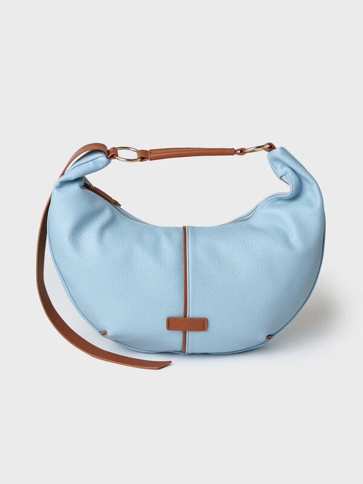 Женская сумка трендовой формы "луна". Сумка выполнена из мягкой искусственной кожи голубого цвета с отделкой  ремнями карамельного цвета. Сумку можно носить на плече. Сумка имеет одно отделение на молнии. Внутри есть три кармана: два открытых и один на молнии. Параметры сумки: высота - 30 см, ширина - 44 см, глубина - 6 см. В подарок идет брендированный пыльник.
