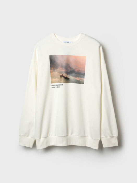 Мужской свитшот оверсайз. Выполнен из хлопкового футера без начеса. На груди расположен крупный принт — репродукция картины Айвазовского «Радуга». Под изображением — подпись с названием и датой создания картины. Горловина, манжеты и низ изделия выполнены из эластичного риба, что обеспечивает комфортную посадку. Можно составить family look c детским вариантом аналогичного дизайна.