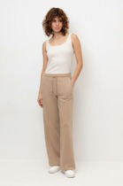 Брюки из мягкого двухцветного футера. Внутренняя сторона изделия представлена в натуральном цвете хлопка, внешняя в нежно-розовом. За счет использования крашенной пряжи, данный вид полотна прошел минимальную обработку, что придало изделию мягкость и шелковистость.