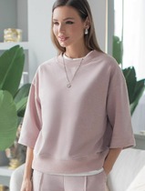 Объемный свитшот из двухцветного трикотажного футера. Внутренняя сторона изделия представлена в натуральном цвете хлопка, внешняя в нежно-голубом. За счет использования крашенной пряжи, данный вид полотна прошел минимальную обработку, что придало изделию мягкость и шелковистость.