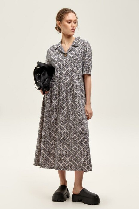 Летнее платье в стиле поло выполненное из премиального трикотажа пике. Свободный силуэт, наличие боковых карманов и геометрический рисунок придают изделию спортивный и одновременно романтический стиль. 100% хлопок в составе обеспечивает комфорт в жаркую погоду.