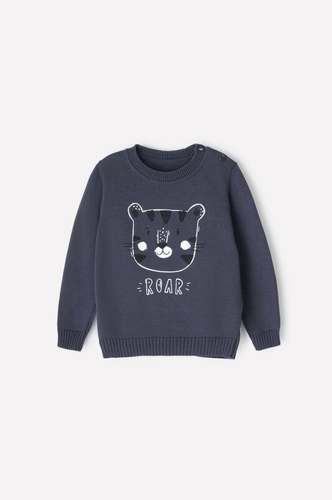 Вязаный джемпер с втачными рукавами. Украшен изображением тигрёнка. Связан из хлопковой пряжи. На рукавах эластичные манжеты. Внизу мягкий пояс. Застёгивается на пуговицу.