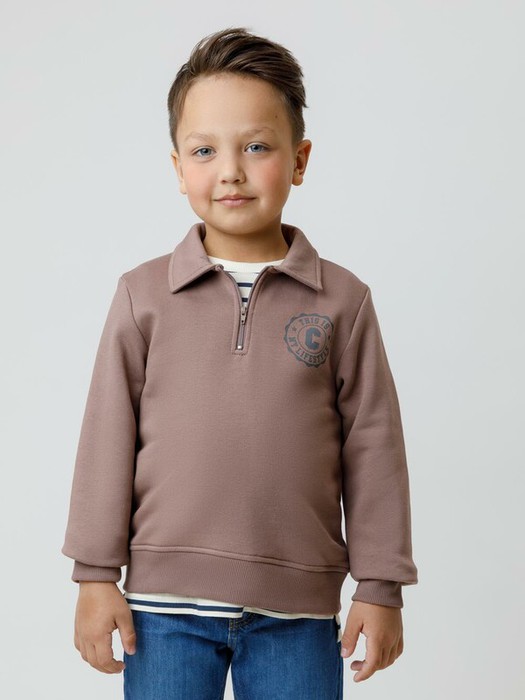 Свитшот с воротником для мальчика. Изготовлен из высококачественного петельчатого футера. В составе 80% натурального хлопка и 20% полиэстера, при этом полиэстер ввязан внутрь по особой технологии и не соприкасается с кожей. Манжеты и пояс выполнены из эластичного полотна. На груди короткая застёжка на молнию. Оригинальный принт выполнен из стойких текстильных гипоаллергенных красителей. Изделие сохраняет цвет и форму после многократных стирок.
