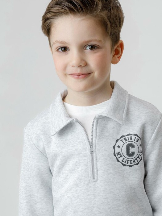 Свитшот с воротником для мальчика. Изготовлен из высококачественного петельчатого футера. В составе 80% натурального хлопка и 20% полиэстера, при этом полиэстер ввязан внутрь по особой технологии и не соприкасается с кожей. Манжеты и пояс выполнены из эластичного полотна. На груди короткая застёжка на молнию. Оригинальный принт выполнен из стойких текстильных гипоаллергенных красителей. Изделие сохраняет цвет и форму после многократных стирок.