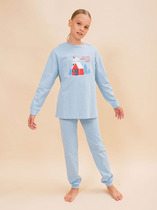 Трикотажный пижамный комплект из футера с начёсом, произведённого из натурального хлопка. У джемпера длинные рукава со спущенными плечами и эластичная мягкая горловина и манжеты. Брюки с удобным поясом на резинке, внизу манжеты. Оригинальная набивка  выполнена из стойких, гипоаллергенных текстильных красителей. Все трикотажные полотна производятся в соответствии с нормами Швейцарского сертификата ЭкоТекс.