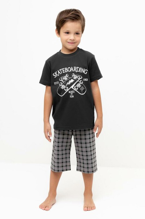 Трикотажная пижама из натурального хлопка. Футболка с короткими втачными рукавами и шорты с эластичной резинкой в поясе. Оригинальные набивка и принт выполнены из стойких гипоаллергенных текстильных гипоаллергенных красителей. Изделие сохраняет цвет и форму после многократных стирок. Все трикотажные полотна производятся в соответсвии с нормами швейцарского сертификата ЭкоТекс.
