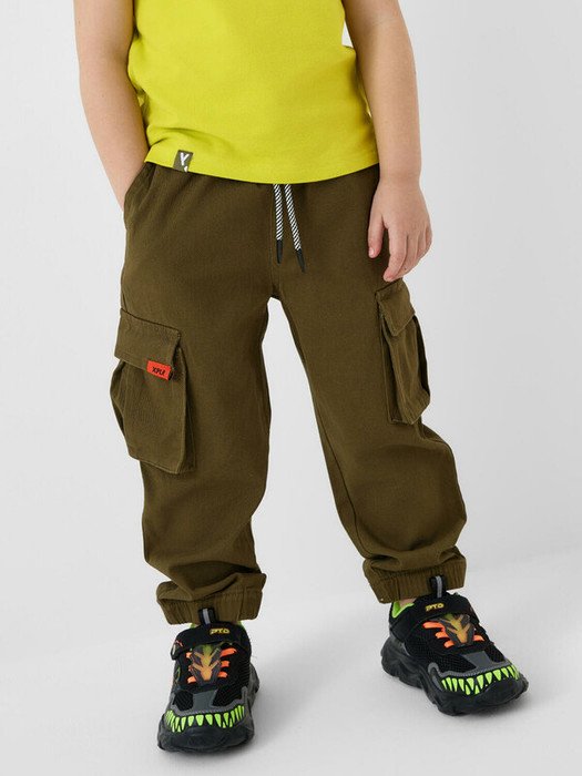 Брюки-джоггеры детские для мальчика. Выполнены из хлопкового текстиля твилл. Модель свободного кроя со средней посадкой на талии. Пояс выполнен на резинке, дополнительно регулируется шнурком. По бокам — удобные карманы, и накладные карманы-карго. В нижней части брючин предусмотрены резинки для лучшей фиксации.