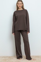 Сорочка женская из гладкокрашенного вискозного полотна, полуприлегающего силуэта, средней длины, без рукавов на широких бретелях, с разрезами в боковых швах. На полочке горловина овальной формы переходит в V-образный углубленный вырез на спинке, отделанный кружевом. Декоративным элементом является имитация «шнуровки» в виде перекрещенных между собой четырех шнурков, вытачанных из окантовки и прикрепленных к кружеву на спинке. Низ изделия и разрезы обработаны узкой обметочной строчкой, создающей волнистый край.