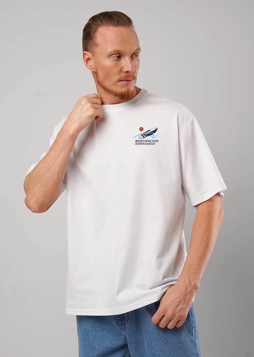 Футболка свободного кроя с округлой горловиной выполненная из хлопкового полотна, с акцентным принтом на груди. Данная модель подойдет к джинсам или шортам.