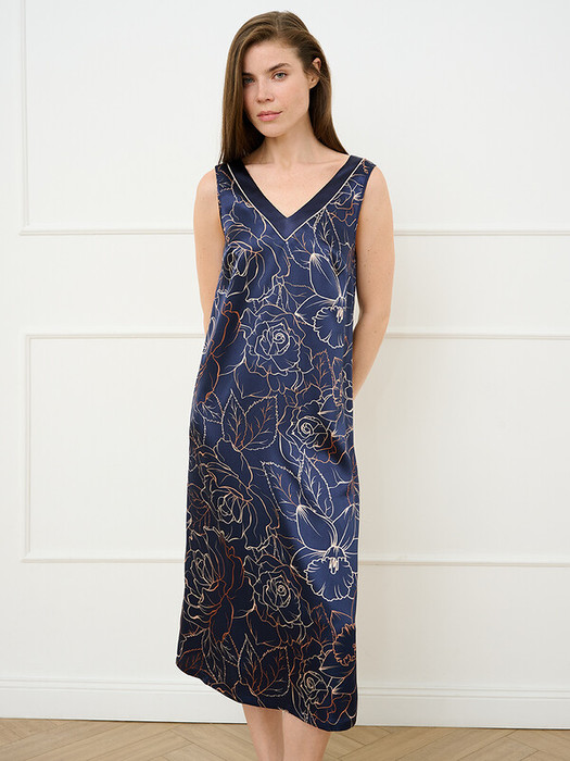 Сорочка мягко струится по фигуре и изящно подчёркивает декольте. Элегантный силуэт, лёгкое сияние материала и утончённый принт позволяют создать эффектный домашний образ.