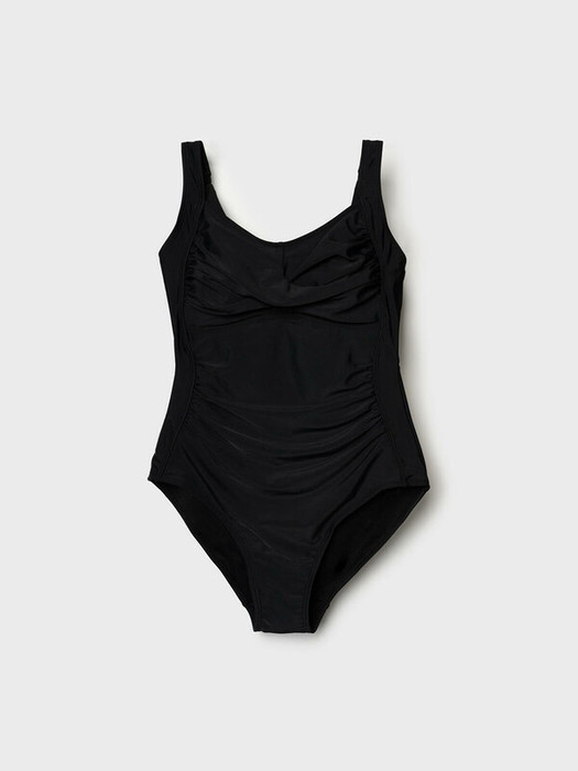 Женский слитный купальник. Перед оформлен мягкой драпировкой и перекрещивающимися складками, создающими визуальный эффект запаха. По бокам — сборки, которые визуально стройнят фигуру. Изделие выполнено из эластичной ткани, внутри есть подкладка. Бретели широкие, регулируются по длине с помощью металлической фурнитуры. На спинке — небольшой металлический значок. Внутри — чашечки для поддержки груди. Благодаря UF-защите, ткань сохраняет первоначальный вид даже при длительном пребывании на солнце. Подойдет для пляжа, отдыха и активного лета.