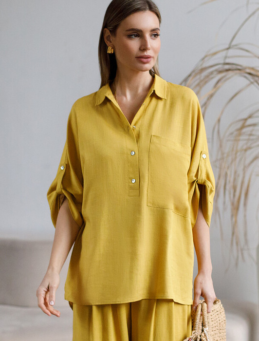 Совместные покупки Омск Женская одежда Блузки, рубашки — 21.04 Vilatte Блузка с цельнокроеным рукавом изо льна с вискозой D29.237 горчич
