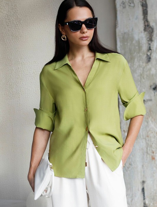 Блузка светло-оливкового цвета сочетает в себе комфорт и элегантность благодаря материалу из вискозы с лиоцеллом. Аккуратный отложной воротник подчеркивает утонченность образа, а продолговатые металлические пуговицы золотистого цвета добавляют выразительный акцент и  придают блузке благородный вид. Широкие манжеты на рукавах привлекают внимание и делают силуэт современным. Спущенная линия плеча формирует расслабленный, но стильный внешний вид, что идеально для тех, кто ценит индивидуальность и уверенность в деталях. Крой продуман так, чтобы подчеркивать достоинства фигуры и на больших размерах, создавая гармоничный силуэт без лишних усилий. Ткань из вискозы с добавлением лиоцелла обеспечивает приятные ощущения и отличную посадку, струится на теле и охлаждает в жаркую погоду. Рубашка легко впишется как в деловой гардероб, так и в повседневный стиль, позволяя выглядеть безупречно независимо от ситуации.