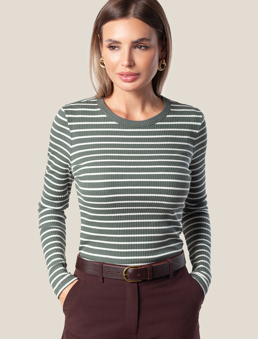 09.04 Vilatte Лонгслив из трикотажа в широкий рубчик D49.984 оливковый-белый