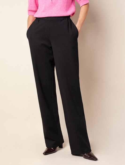 Прямые брюки выполнены из плотного трикотажа джерси. Модель дополнена боковыми карманами. Посадка на талии фиксируется эластичным поясом на резинке. Заутюженные стрелки визуально вытягивают силуэт. Изделие хорошо держит форму и почти не мнется во время использования.