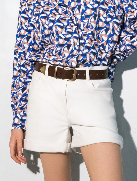 Шорты выполнены из эластичного денима. Модель со свободной посадкой и подворотами дополнена декоративной стиркой и тонкими коричневыми строчками. За счет эластана изделие хорошо тянется и гарантирует комфорт и формоустойчивость. Подходит для любой фигуры. Сзади фирменный брендированный патч.
