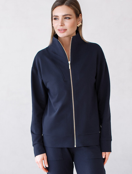 Жакет выполнен из футера двухнитки с эластаном. Модель без карманов с воротом стойка и застежкой на молнию серебристого цвета. Эластичный материал гарантирует комфорт и формоустойчивость. Сочетается в костюме с брюками D44.138, D44.139 и шортами D48.008. Изделие дополнено металлическим логотипом бренда.