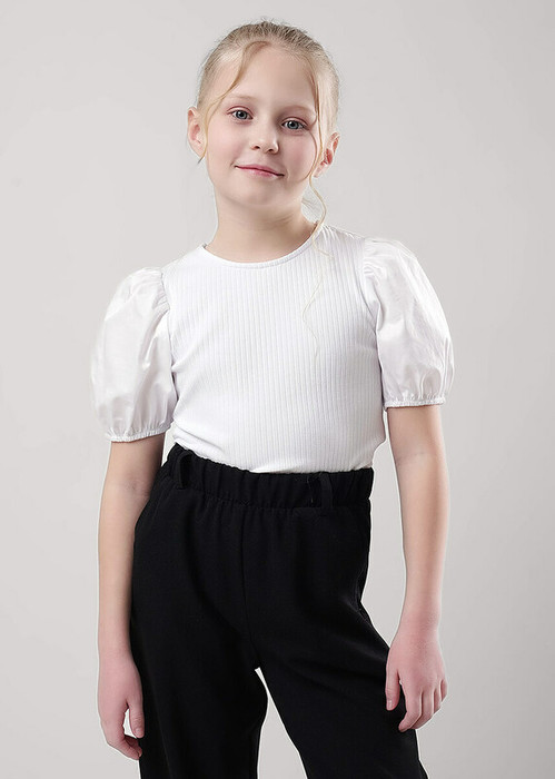 Стильная базовая блузка станет отличным дополнением к вашему гардеробу! Модель выполнена из лапши и дополнена короткими пышными рукавами из поплина. Модель отлично подойдет для создания классных школьных образов!