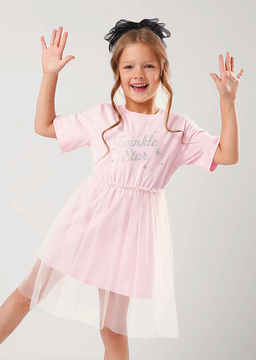 Нарядное платье с сеткой абсолютная находка для юных модниц! Пышная юбка из сетки,короткий летящий рукав,и подклад платья - из хлопка с эластаном. Платье дополнено мерцающим принтом спереди.