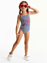 Слитный купальник на лямках для девочки. Украшен оборками. Оригинальная набивка выполнена из стойких гипоаллергенных красителей.