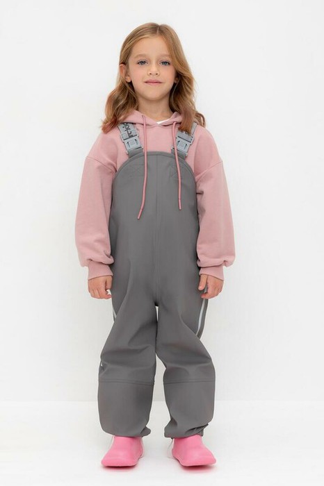 Полукомбинезон без подкладки, непромокаемый, на эластичных бретелях с регулировкой длины при помощи фастекса, сбоку под проймой кнопки для регулировки объема, низ брючин с эластичной резинкой. Для фиксации полукомбинезона используются съемные силиконовые штрипки. Светоотражающий принт в виде полосы сбоку.