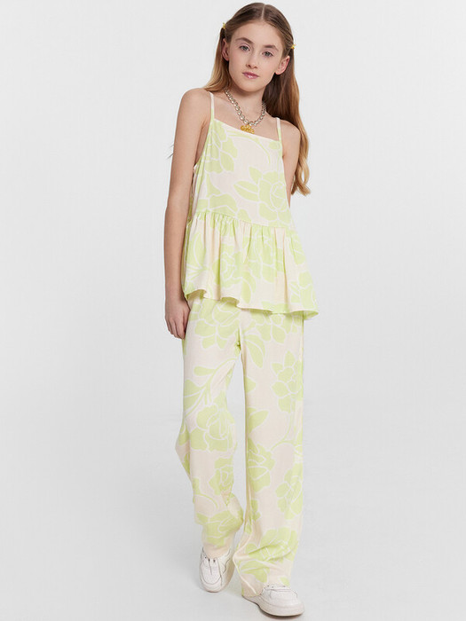 Комплект состоит из топа и брюк. Топ с узкими бретелями и с воланом на сборке по низу. Брюки прямые с цельнокроенным поясом. Внутрь пояса застрочена эластичная тесьма. Низ изделия обработан швом в подгибку с закрытым срезом.