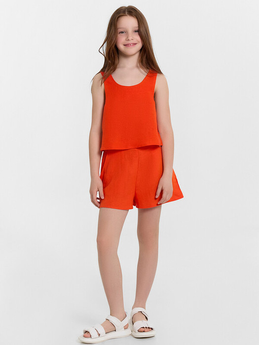 Комплект состоит из топа и шорт. Топ А-силуэта. Перед и спинка цельнокроеные. Круглый вырез горловины. Обтачка горловины и пройм из основного полотна. Низ топа обработан швом в подгибку сзакрытым срезом.