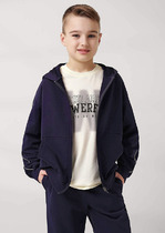 Жакет из трикотажного футера с теплым подчесом. Спущенная линия плеча гарантирует свободу движений. Прямой свободный силуэт, уютный капюшон, длинные рукава на манжетах, удобный карман-кенгуру, центральная застежка на молнию – эта модель наверняка понравится вашей девочке.